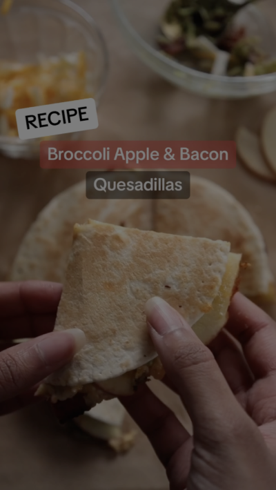 Add ready-to-eat fall produce like apples, broccoli stems and leafy greens to a cutting board and top with deli turkey slices, cooked bacon strips, your favourite vinaigrette along with a selection of dried fruit and toasted nuts. Using a sharp knife, chop and mix ingredients together. Add sandwich mixture to whole grain bread, grill on a panini press, cut and enjoy!