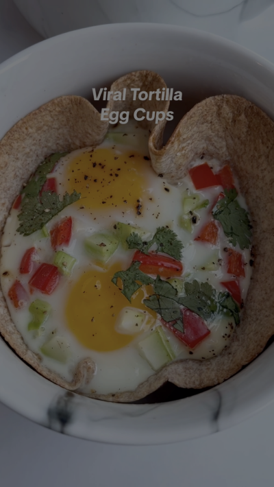 Preheat oven to 177 °C (350 °F) and grease two small oven safe bowls or ramekins. Press a tortilla into each ramekin. Crack two eggs into each tortilla. Add on salt/pepper, bell peppers, broccoli stems and cilantro. Bake ~20 mins until egg whites are set and enjoy!